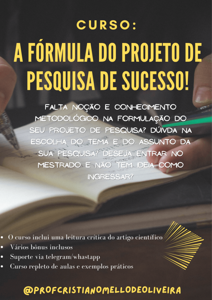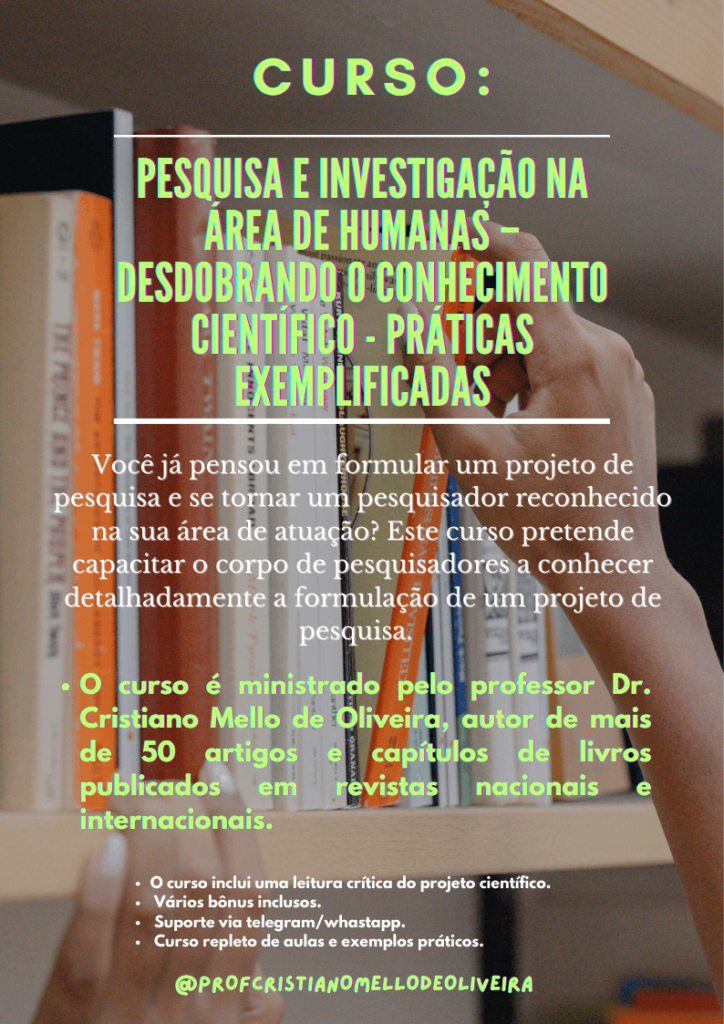 Você já pensou em formular um projeto de pesquisa e se tornar um pesquisador reconhecido na área de Humanas? Já pensou em realizar um estágio de doutorado no exterior? Já imaginou formular projetos de extensão que envolvam a comunidade externa da sua universidade? Este curso pretende capacitar o corpo de pesquisadores a conhecer detalhadamente a formulação de um projeto de pesquisa. Objetiva também instigar o interesse pela atitude curiosa da pesquisa científica no campo das Humanidades. Pretende abordar como nasce um projeto de iniciação científica. Por soma, o pesquisador irá adquirir brevemente conhecimentos acerca do campo da metodologia científica, examinando como ocorre a escolha, delimitação, formulação de hipóteses num projeto de pesquisa.