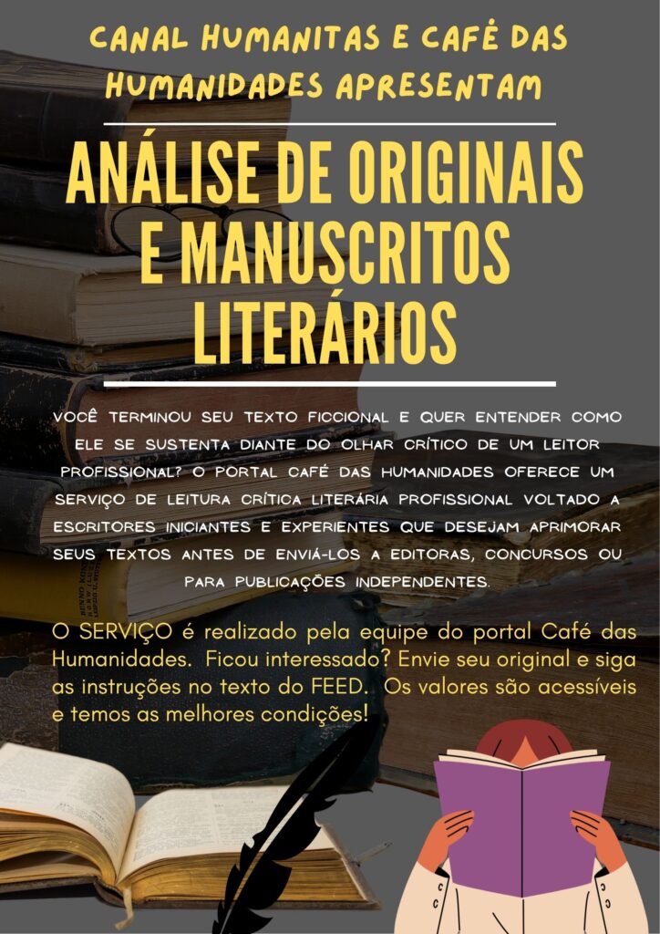 OBS: O serviço dispõe de uma leitura crítica do seu texto literário. Serão analisado os seguintes pontos: estrutura do enredo, questões formais e estílisticas, formulação das personagens e diálogos, coerência interna e externa, criação descritiva do espaço ou cenário etc. Estabeleça um orçamento, preenchendo o formulário ao clicar no botão.